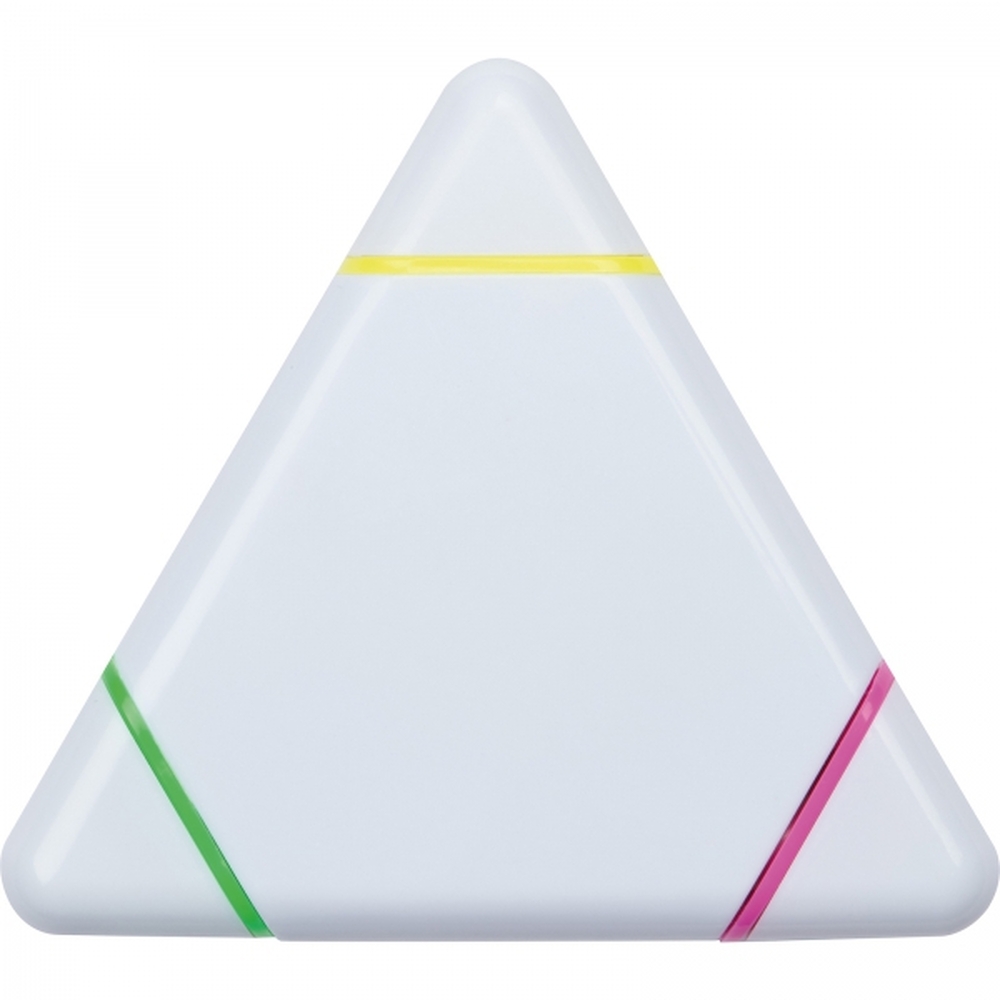 Trzykolorowy zakreślacz, wykonany z materiałów pochodzących z recyklingu, piszący na żółto, różowo i zielono.